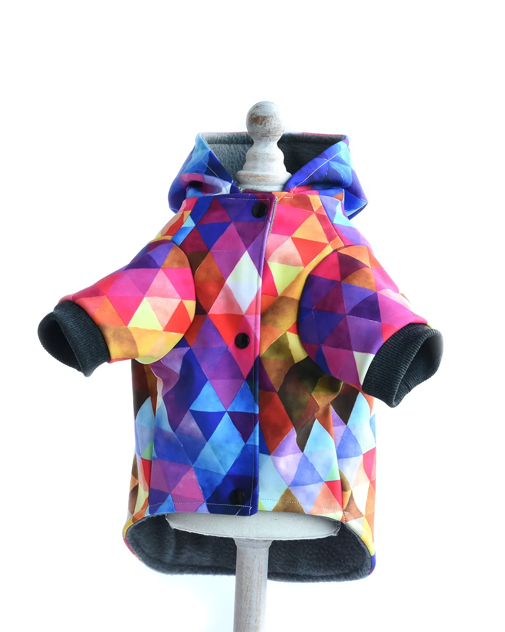 La maneci geaca caine este finisata cu o banda din bumbac de culoarea gri, care fixeaza perfect haina pe corpul catelului.