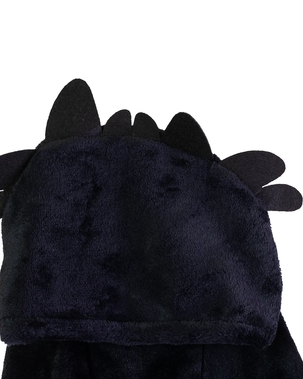 Hanorac pufos pentru câini negru, cu glugă cu aripioare tip dragon. Perfect pentru zile reci și pentru un look adorabil și diferit.